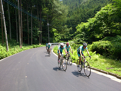 足の疲労がそこそこありますが、メンバーみんなまだまだ元気です。暑い国道138号線を抜けると再び霧に包まれた山中湖。そして道志みちに突入。山伏峠はそれほど長くなく、集団のままクリアし、ダウンヒル開始です。