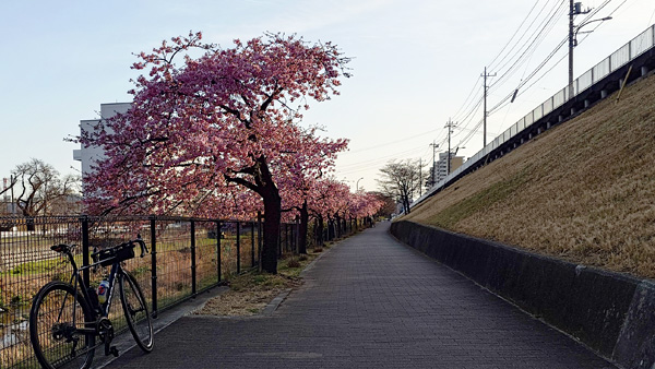 多摩湖サイクリングロードをまたぐ空堀川の河津桜は満開を迎えていました。