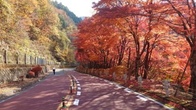 奥多摩湖小河内ダムへの上りも綺麗に色づいています。