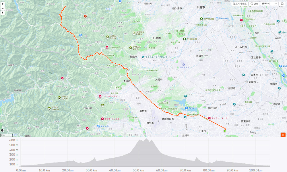 こういうコンディションの日は峠の景色がきれいなので、展望台からの眺めがいい正丸峠をコースに選びました。